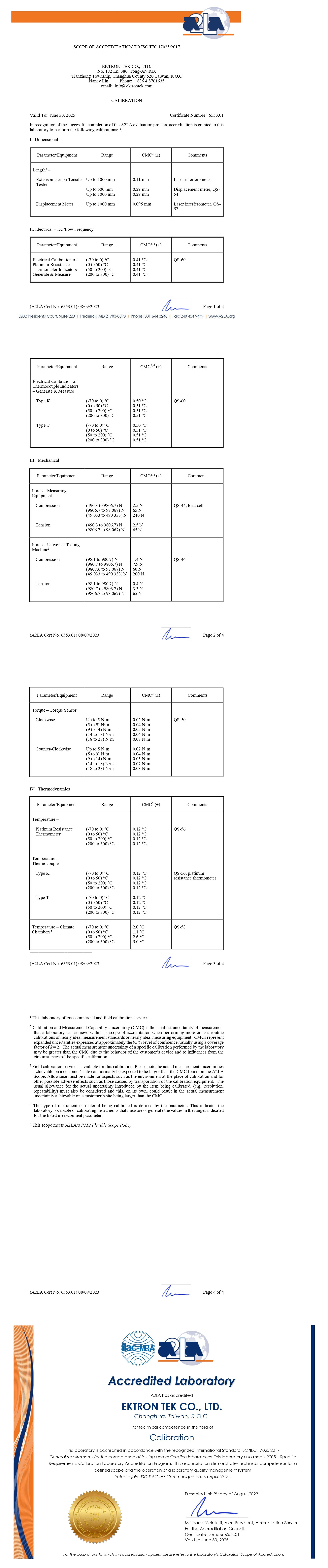 為提供顧客更詳盡的專業技術服務,曄中科技有限公司 校正實驗室(以下簡稱曄中科技) 已於2023年6月30日取得美國實驗室認可協會(American Association for Laboratory Accreditation,簡稱A2LA)ISO/IEC 17025:2017 校正實驗室能力一般要求國際認證。